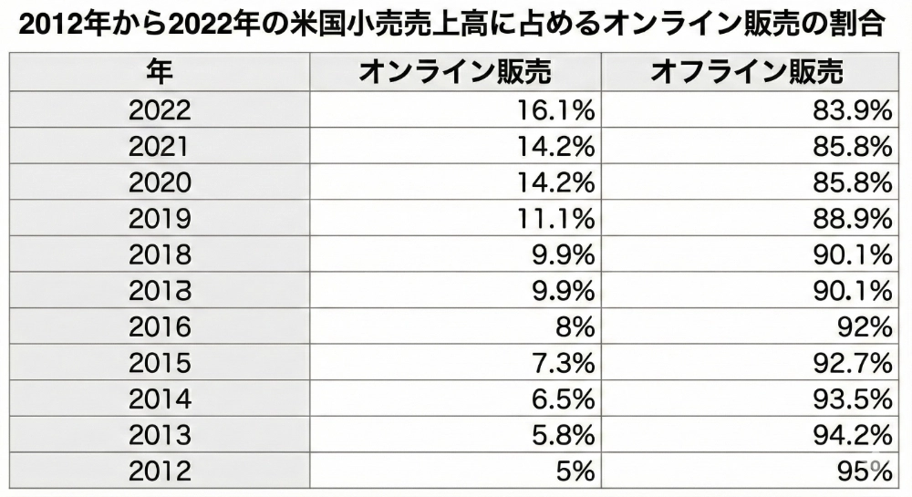 過去10年間で、オンライン取引量は増加の一途をたどっています。これは、オンラインショッピングが消費者の間でより一般的になっていることを示しており、今後もオンラインでの購入が増加し続けるという上昇トレンドを示唆しています。