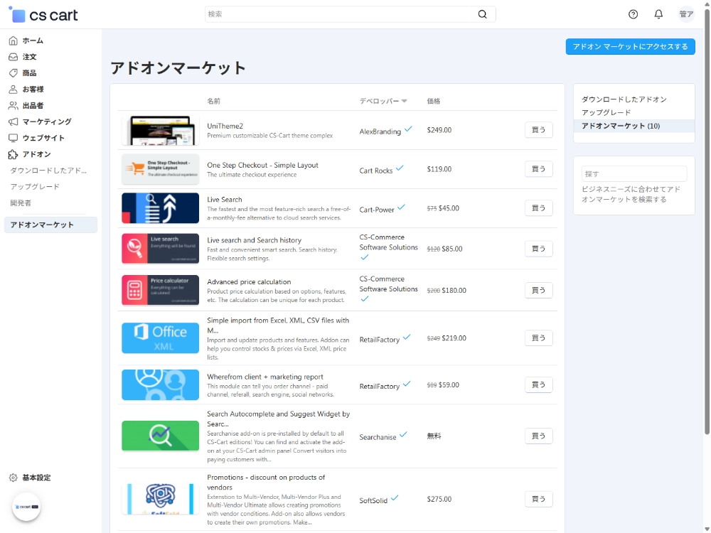 お客様に向けては、CS-Cart 国際版(公式)はマーケットプレイスのUXを向上させるための最新ツールも、サードパーティーから有償アドオンとして提供されています。