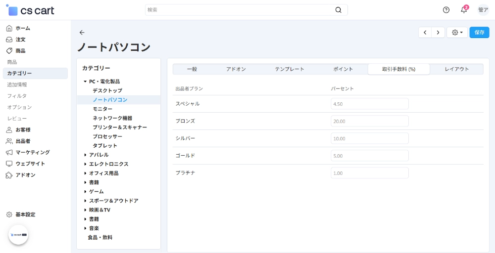 CS-Cart 国際版(公式)では、商品カテゴリーに応じて手数料を設定できます。例えば、日用品などの利益率の低い商品には、低い手数料を設定して出品者を引き付けることができます。一方、ジュエリーなどの利益率の高い商品には、高い手数料を設定して、これらの出品者からの収益を増やすことができます。CS-Cart 国際版(公式)でこの機能を有効にするには、出品者プランに標準搭載されている「出品者プラン:カテゴリー別取引手数料」アドオンを有効化してください。これにより、カテゴリー設定で特定のカテゴリーに独自の手数料を設定できるようになります。