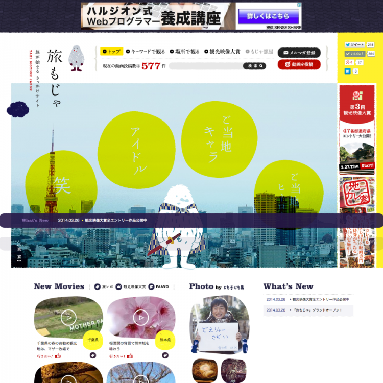 Webサイト公開時には、第三回 観光映像大賞 全エントリー作品他、500本以上のムービーを掲載。サイトをナビゲートするキャラクター「もじゃ」も登場しました。