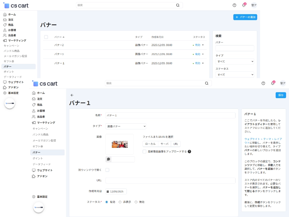 ECサイトの運用では必須となるバナーの管理も管理画面から行うことができます。