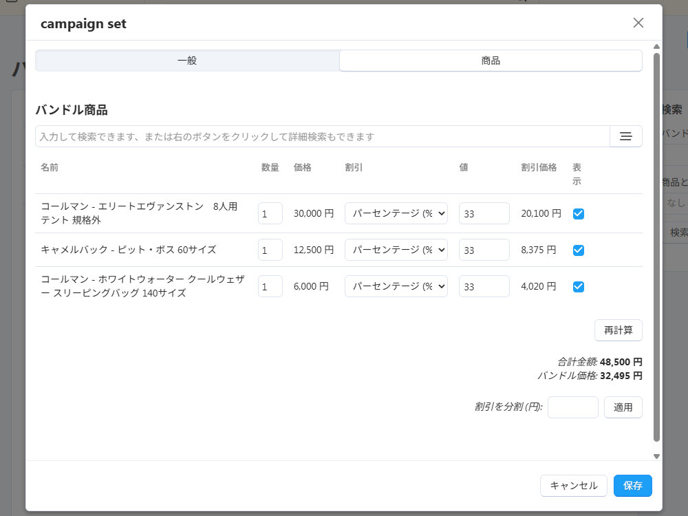 - 割引を分割 (円):テキストボックスに全体の割引金額(円)を入力し、「適用」ボタンをクリックすると、商品の総額を基に「割引価格」と「バンドル販売価格」を再計算します。