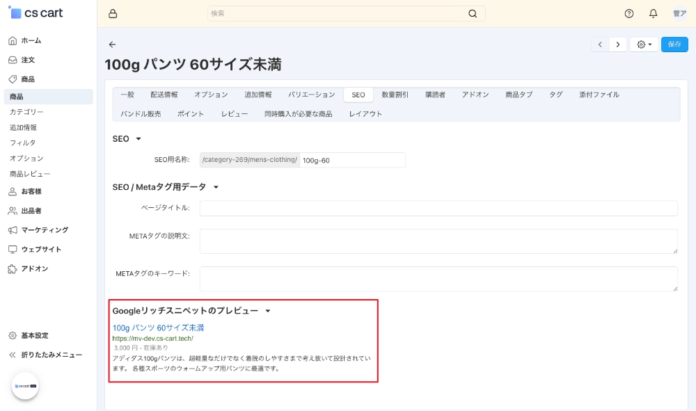 CS-Cart では、商品ページのリッチスニペットが自動的に生成されます。スニペットの内容は、説明や価格などの商品情報に基づいて作成されます。特定の商品のリッチスニペットを確認するには、以下の手順を実行してください。