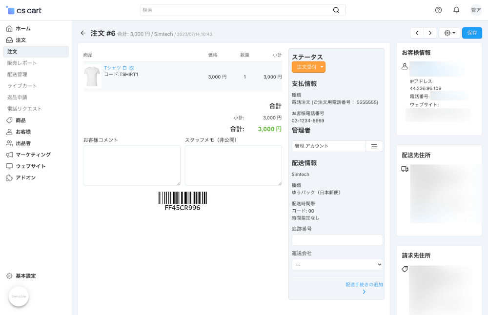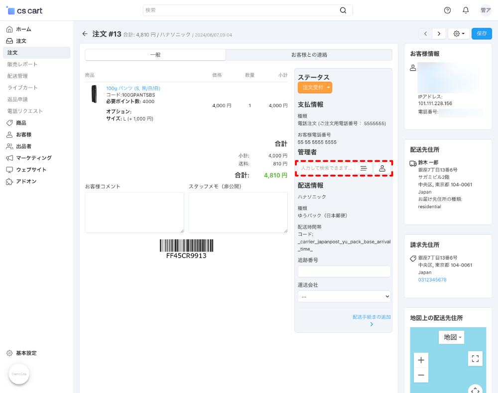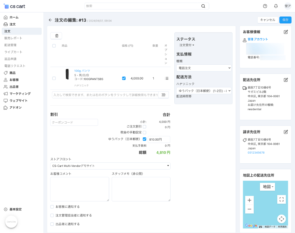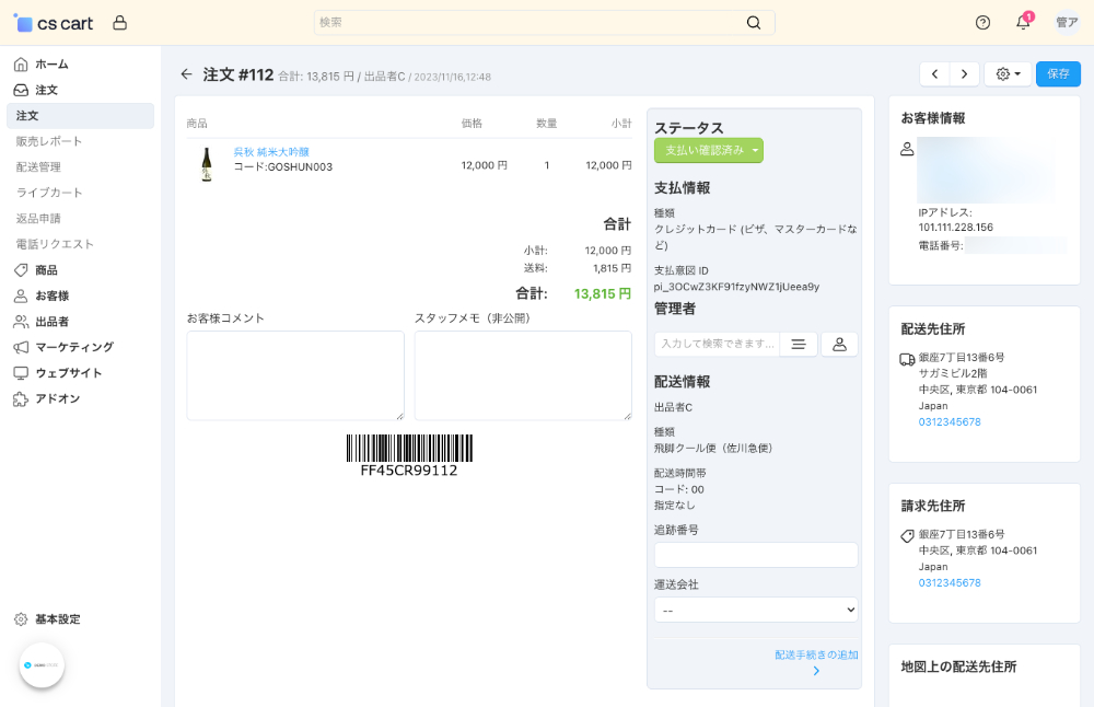右側のパネルで、ステータス、支払情報、管理者、配送情報を入力します。
