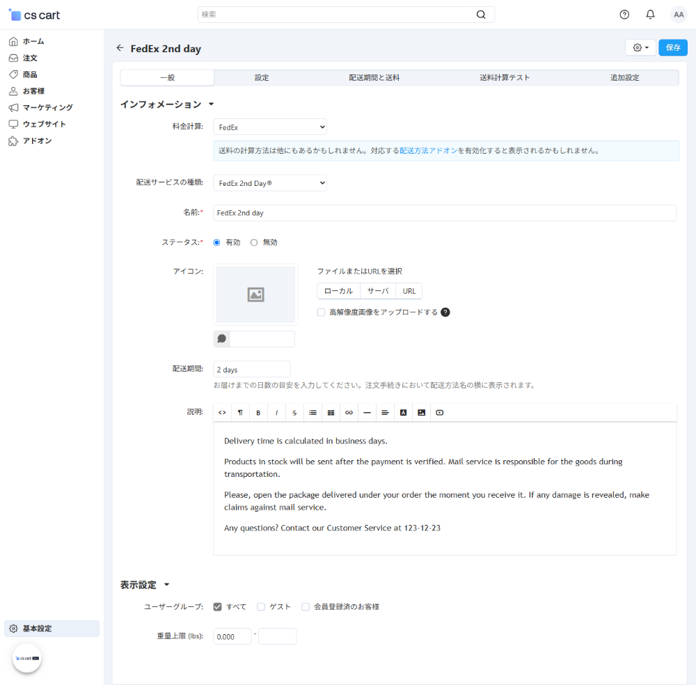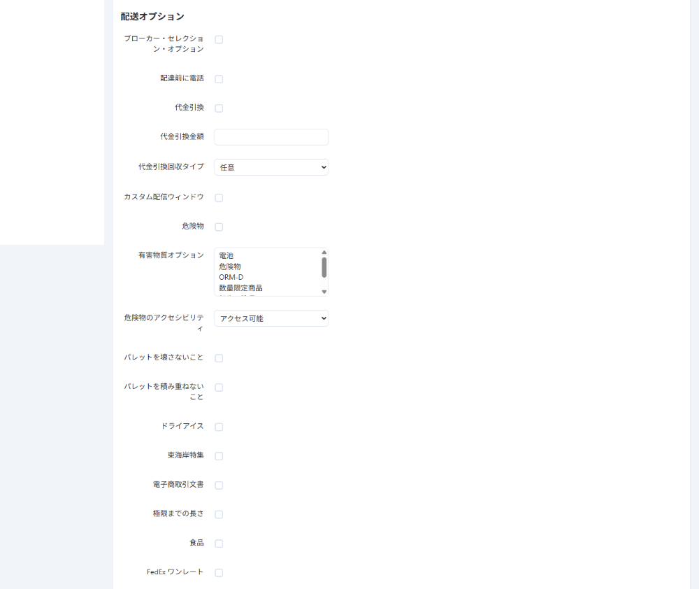 配送オプションは、定められた条件により、FedExから追加される配送料を設定します。