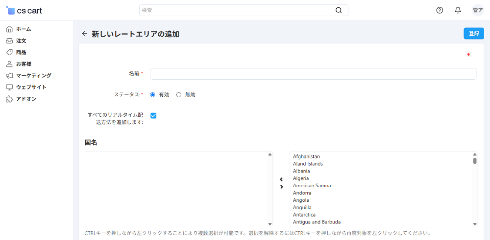 レートエリアの追加画面で、名前を入れますが今回は、「東アジア」としました。