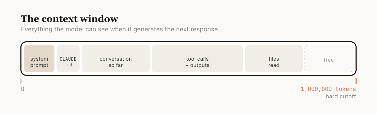 コンテキストウィンドウとは、モデルが次の回答を生成する際に一度に「認識」できるすべての情報を指します。これにはシステムプロンプト、これまでの会話、すべてのツール実行とその出力、読み込まれた全ファイルが含まれます。Claude Codeのコンテキストウィンドウは100万トークンです。