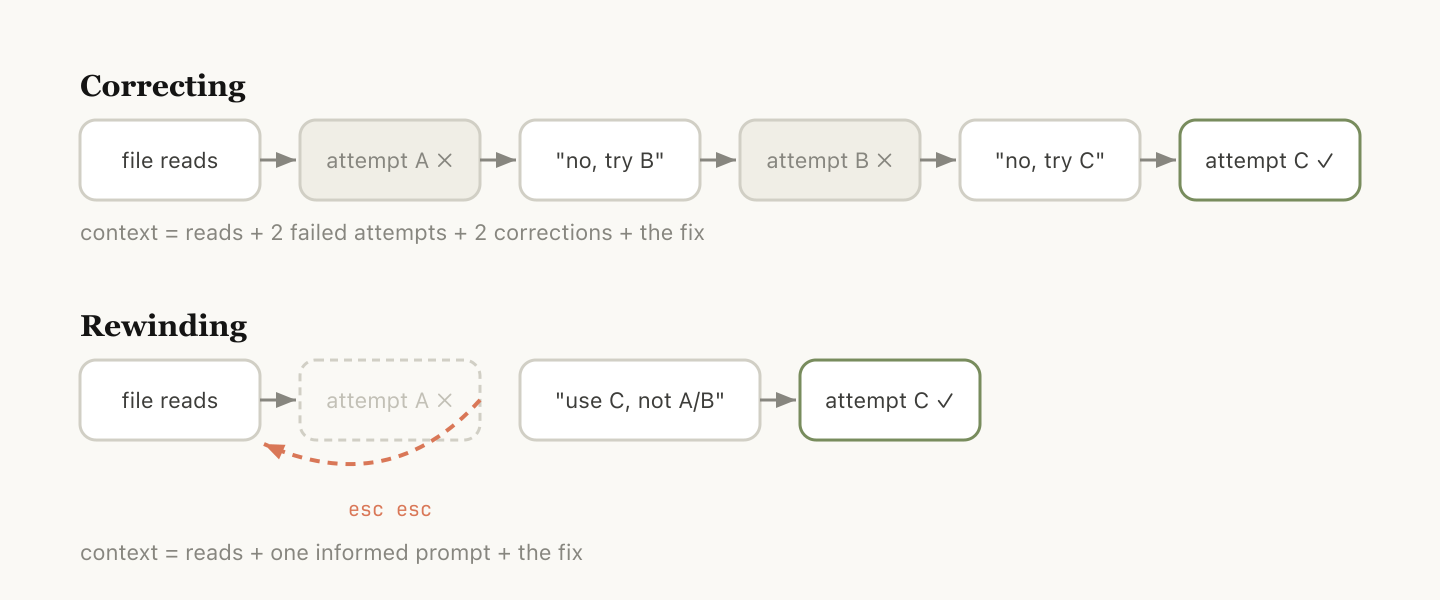 多くの場合、修正を重ねるよりも巻き戻す方が賢いアプローチです。例えば、Claudeが5つのファイルを読み込み、ある手法を試したが失敗したとします。
