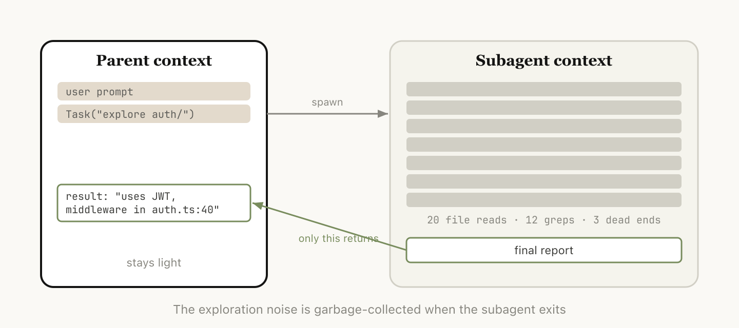 Claudeが、エージェントツールを使ってサブエージェントを起動すると、そのサブエージェントは独自の新しいコンテキストウィンドウを取得します。サブエージェントがそこでどれだけ作業をしても、親エージェントに戻ってくるのは、結果を統合した最終レポートだけです。